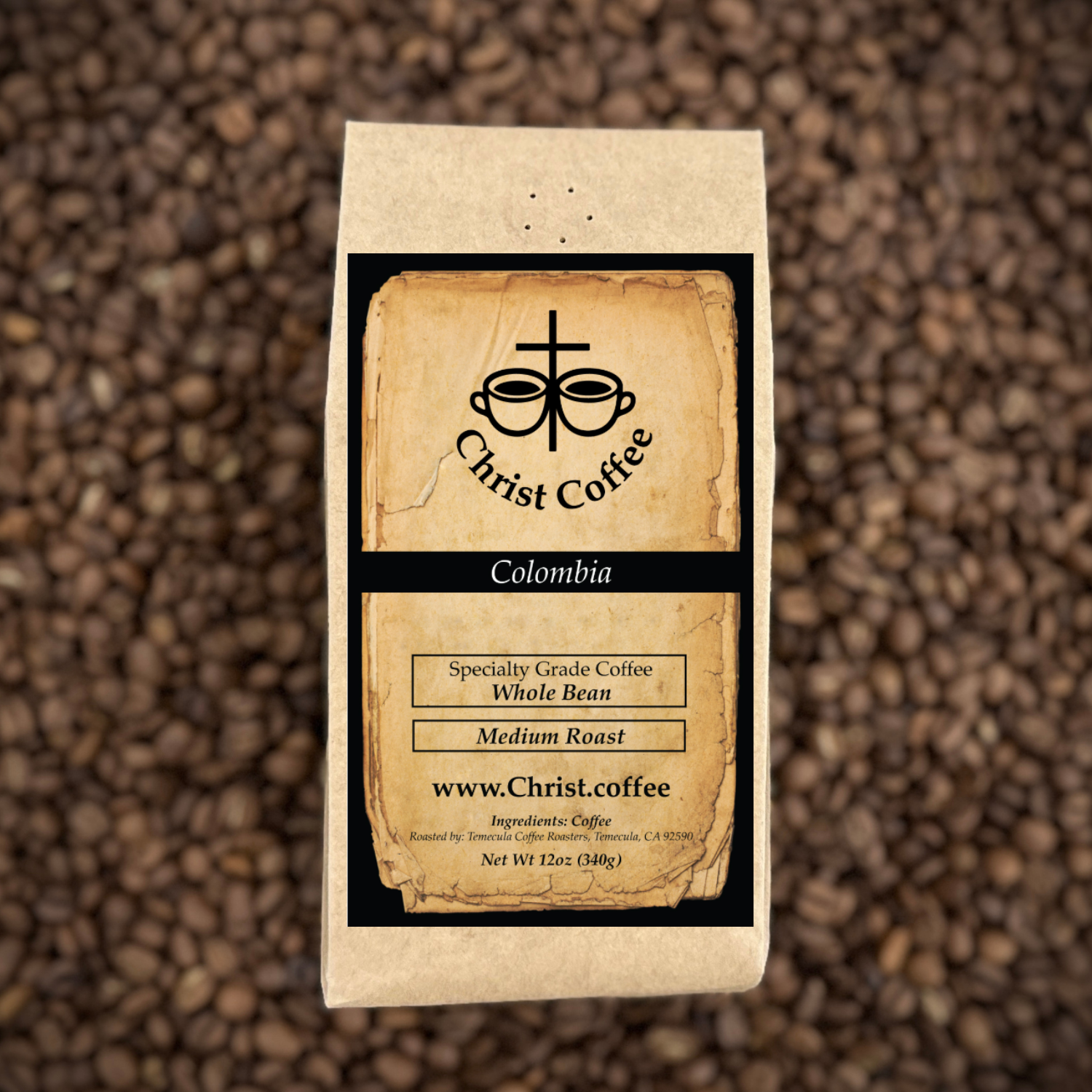 Available Ground or Whole Bean, in sizes from 12oz to 5lb