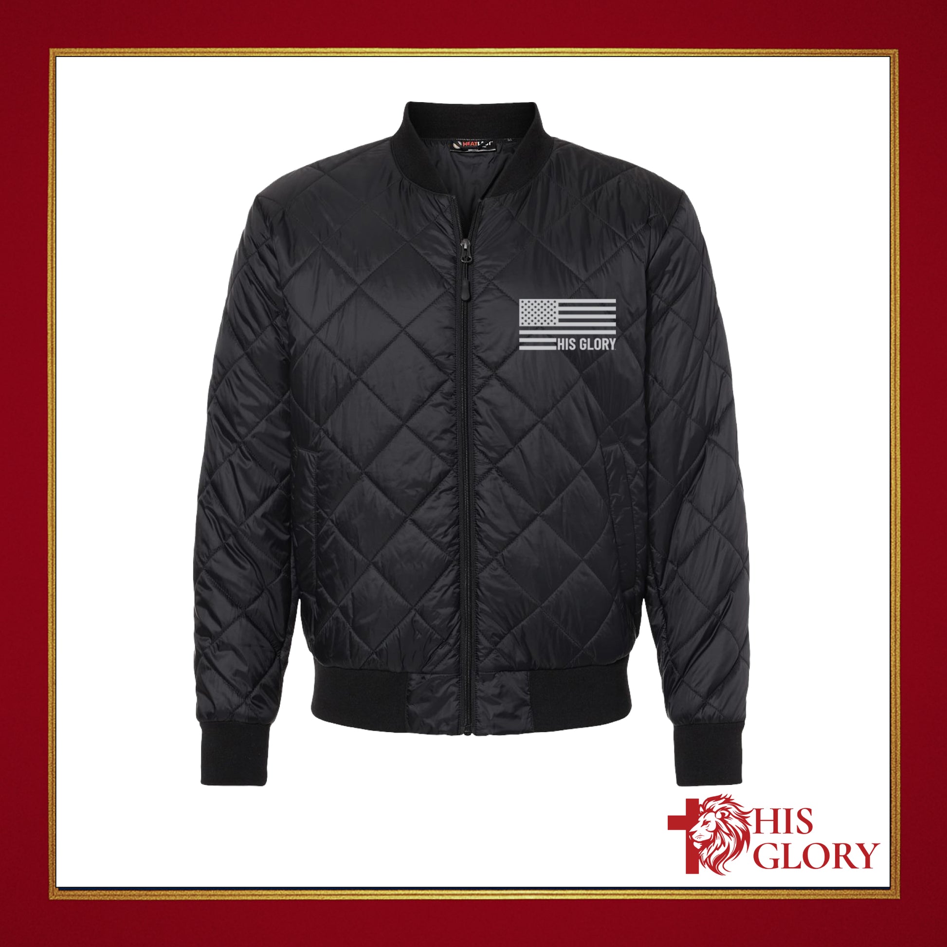 This His Glory Quilted Bomber Jacket combines functionality with refined style for all conditions. Made from 100% coated nylon and insulated with polyester fill, it showcases a distinctive diamond quilted pattern and ribbed-knit accents. Designed to resist wind and water, it comes in black featuring the embroidered His Glory flag or military green adorned with the His Glory Lion embroidery.